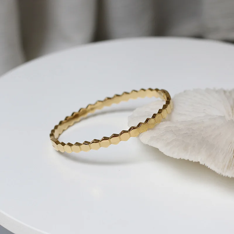 The Hexagon Cuff Bangle. Gold plated, waterproof and tarnish free.